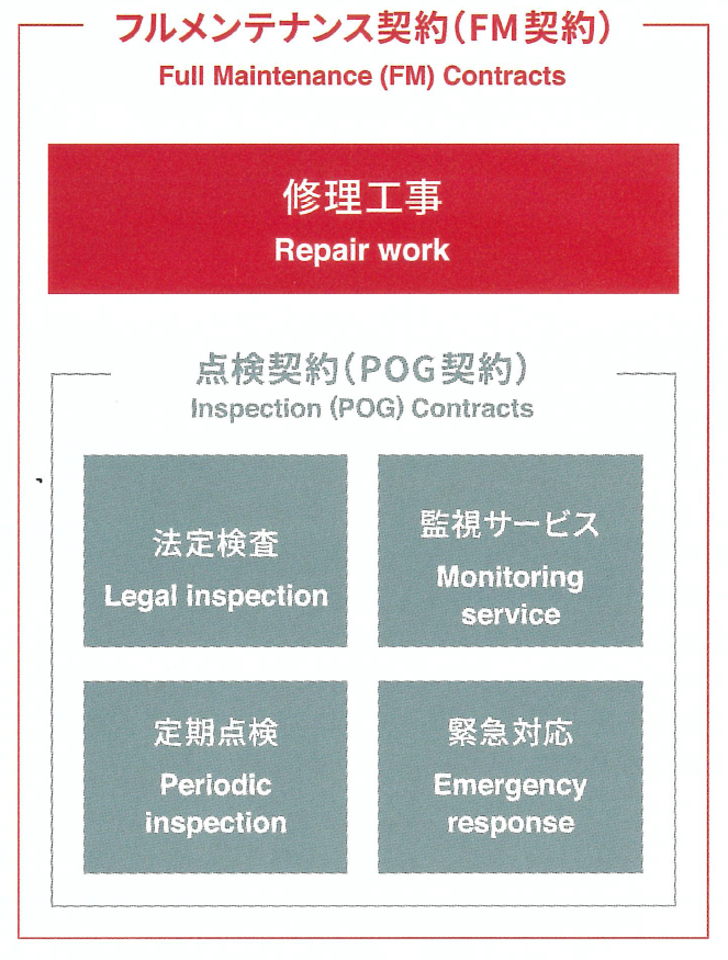 エレベーターに関する機器装置などの各部品の定期的な点検・給油・調整のみ、月々低額の保守料で実施します。消耗品の交換費用はメンテナンス料金に含まれていますが、その他の部品の交換、修理は別料金となります。もちろん作業のクオリティは、フルメンテナンス契約(FM契約)と変わりありません。